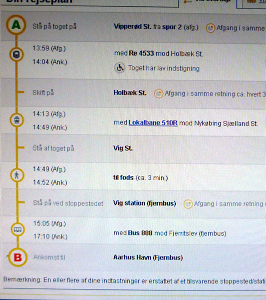 Jeg har ikke smartphone el.l. men har rejseplanen med på mit lommekamera. Og så tillader jeg mig at skrive Århus med den nye retskrivning af 1947, og ikke Aarhus eller Aarhuus eller hvad byen nu har heddet i historiens gang. Roskilde bliver jo heller ikke skrevet med runer. Og hvis nogen synes jeg er en sur gammel mand, nå ja.